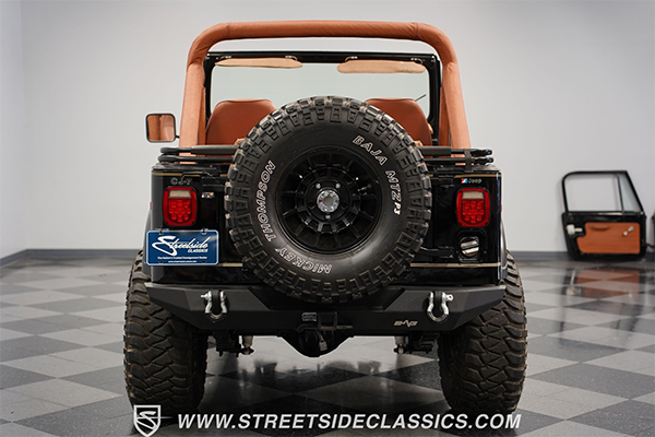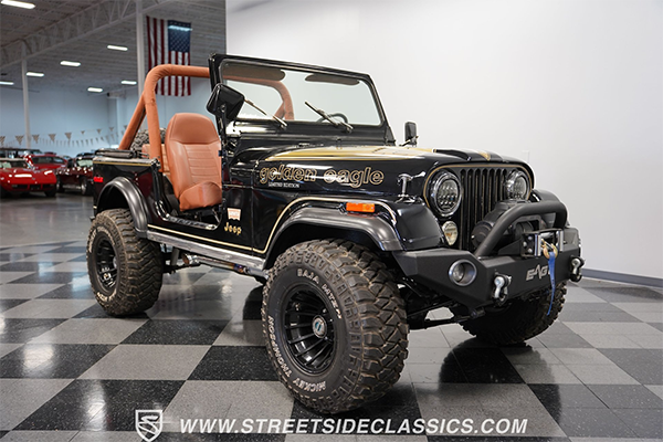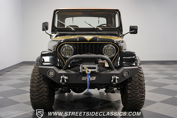 There’s always an adventure awaiting in this 1976 Jeep CJ7 Golden Eagle Tribute. It’s like stepping into a rugged chapter of off-road legend. This Jeep, adorned with spirited Golden Eagle decals, boasts a bold black exterior that captures the essence of the Rocky Mountains. Its commanding presence is further enhanced by 15″ wheels wrapped in 33″ Mickey Thompson AT tires, ready to conquer any terrain easily. The recent full repaint adds a fresh veneer to this CJ7, while the EAG bumpers with a 9,000 lb winch, LED headlights and fog lights, a new soft top, and hard doors all contribute to its ready-for-anything demeanor.