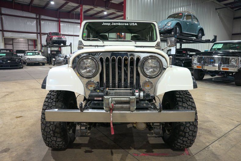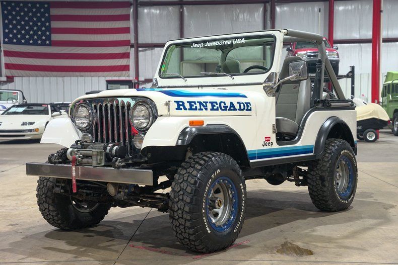 GR Auto Gallery is excited to present this 1978 Jeep CJ5 Renegade Resto Mod that blends classic Jeep character with serious off road capability. Originally finished as a Forest Green Renegade with gold decals and a Levi’s Edition tan interior, this CJ5 now wears a clean white gel coat finish accented by bold blue Phoenix Renegade graphics and a gray and black interior. The fiberglass body was installed in the mid 1990s and still presents very well, while the OEM frame has been professionally reinforced to handle everything this Jeep is capable of. Sitting on factory style wheels with a 3 inch Skyjacker lift, this CJ5 has a purposeful stance that looks right at home both on the trail and at a weekend cruise.
