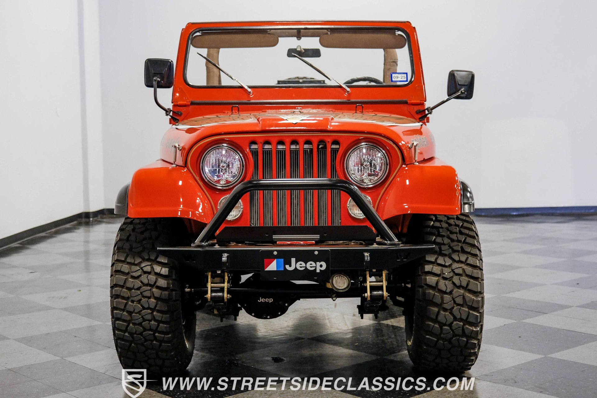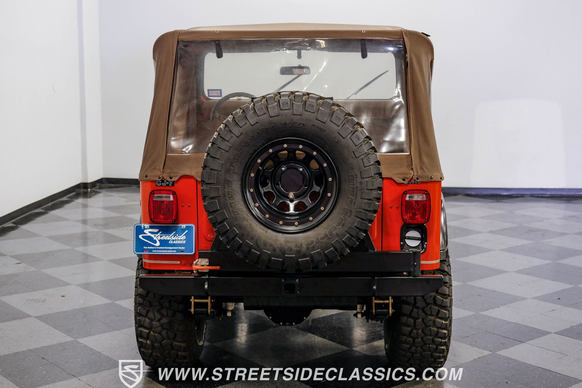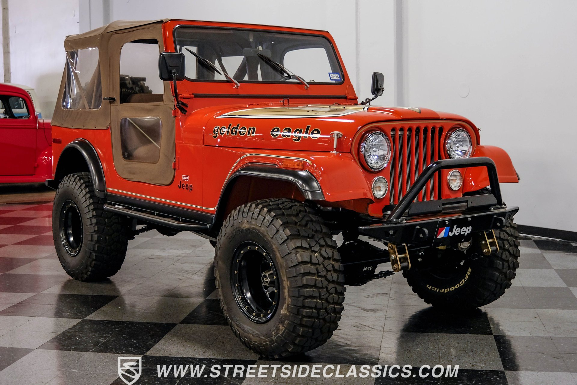 Golden Eagle Decals Mark the Trail-ready Hood of This 1979 Jeep Cj7 Golden Eagle Dressed in Mandarin Orange Paint That Weathers the Elements Naturally. Aggressive Fender Flares Frame the Expedition Stance While 15-inch Wheels Carry 33×12.50r15 Bfg Tires Built for Conquering Varied Terrain. Side Steps Ease Entry After Muddy Creek Crossings, and the Rear-mounted Spare Tire Swings Clear for Quick Trail Repairs. The Removable Soft Top and Doors Invite Wilderness Air During Backcountry Excursions.