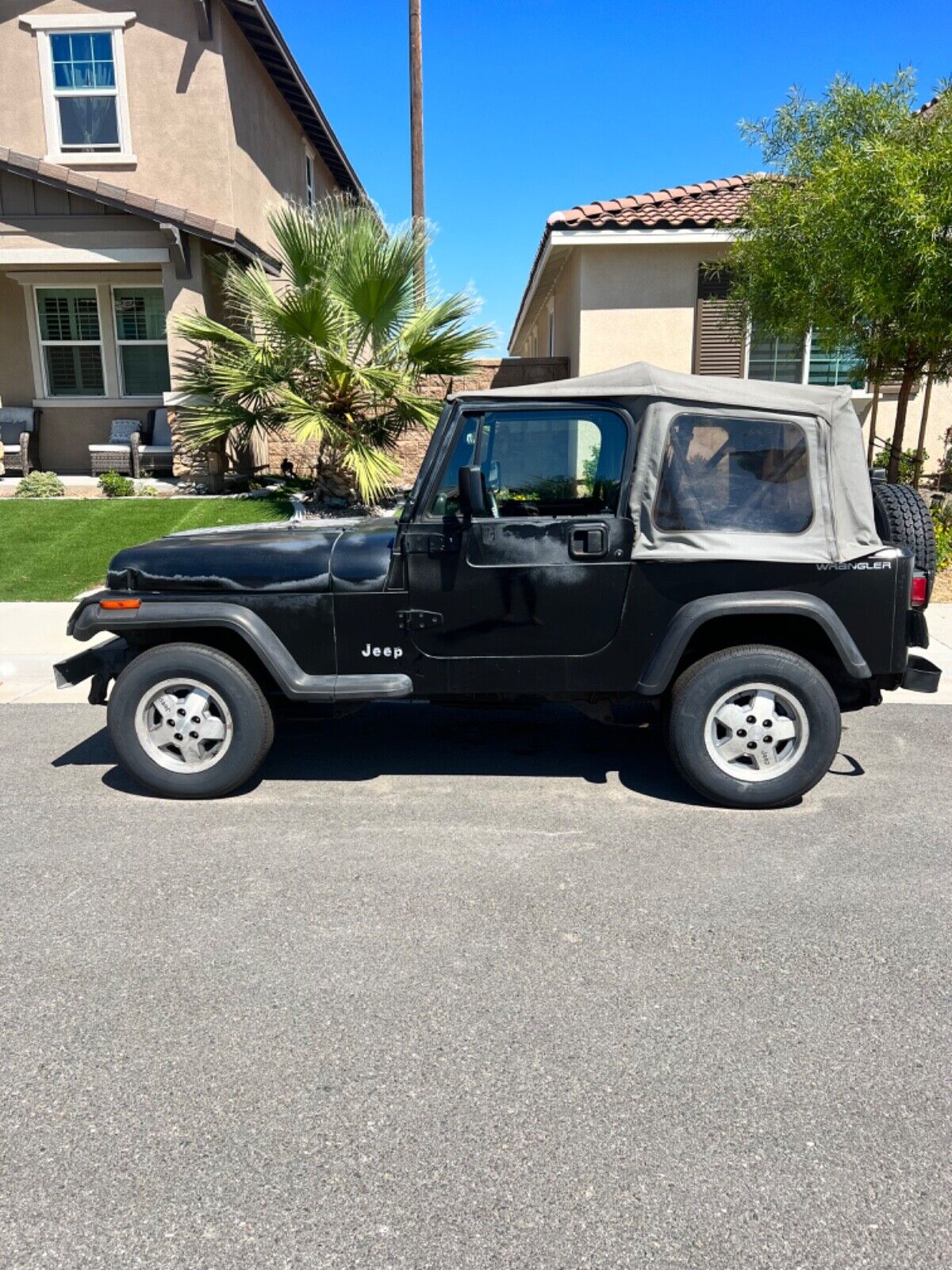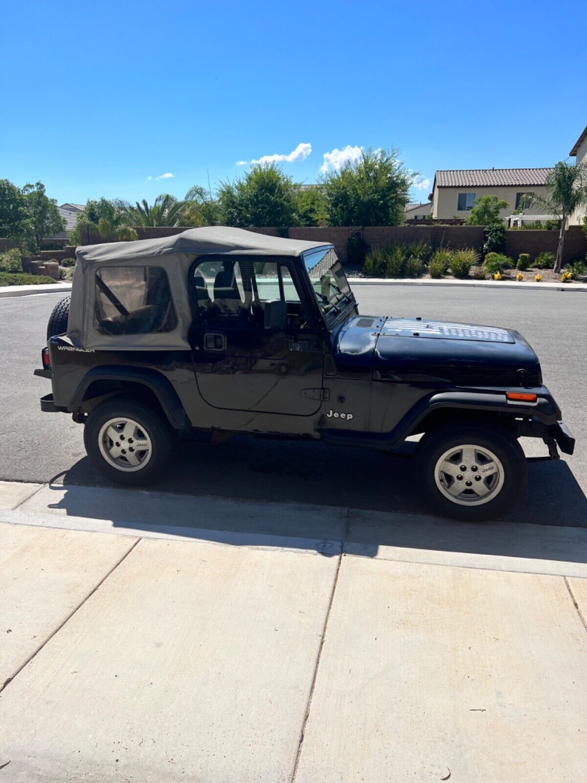 1995 Jeep Wrangler 4×4. Has current California title registration and license. Runs great shifts nice and smooth. Has a new center consul and recently had a complete maintenance overhaul to include new radiator hoses and radiator fluid, oil, change, and oil filter, new transmission fluid, new transmission gasket, new hood hinges, new hood lock downs, and brand new set of four tires. New Bimini top, frame with all canvas window panels included. New windshield hinges also included ready to install.